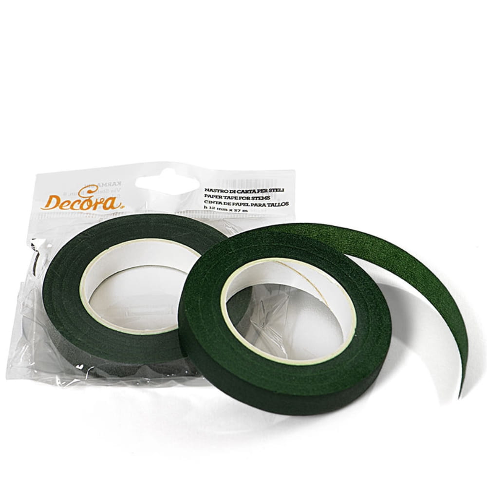Taśma florystyczna do łodyg kwiatów cukierniczych. Papierowa taśma w pięknym naturalnym zielonym kolorze. To estetyczne i proste rozwiązanie do zakrycia drucików podtrzymujących kwiaty. Dzięki nim kwiaty wyglądają bardzo realistycznie. Taśma bardzo przydaje się podczas łączenia kwiatów w bukiety i dodawaniu liści. Kwiaty i dekoracje klejone taśmą należy zabezpieczyć przed włożeniem do ciasta, nie powinny mieć bezpośredniego kontaktu z żywnością. Szerokość taśmy to 12 mm, długość rolki: 27 metrów.
