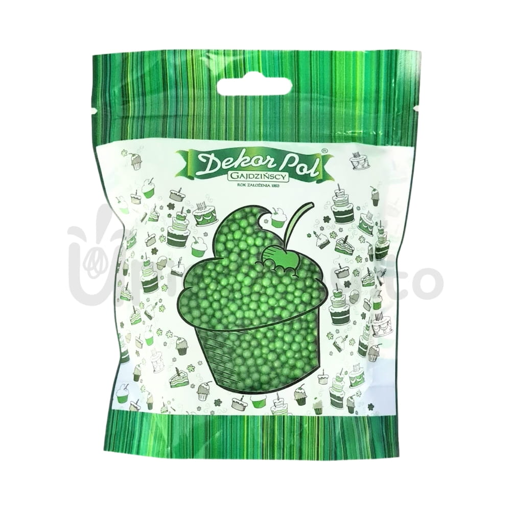Perełki to małe, okrągłe kuleczki. Mają piękny, połyskliwy zielony kolor i 4 mm średnicy. To błyszcząca, cukrowa posypka nie wpływa na zmianę smaku dekorowanych wyrobów, jest wykonana z naturalnych składników i ma smak masy cukrowej. To bardzo uniwersalna posypka, idealna do dekoracji babeczek, ciasteczek, pierniczków, muffinek, tortów, deserów, wypieków, cake pops, pralin, trufli, czekolady, lodów oraz wielu innych słodkich wyrobów, zwłaszcza tych z kremami i polewami. Sprawdzi się na każdą okazję: ślub, komunię, karnawał, urodziny, dzień matki i wiele innych. Zapakowana w torebkę typu doypack 250 g.