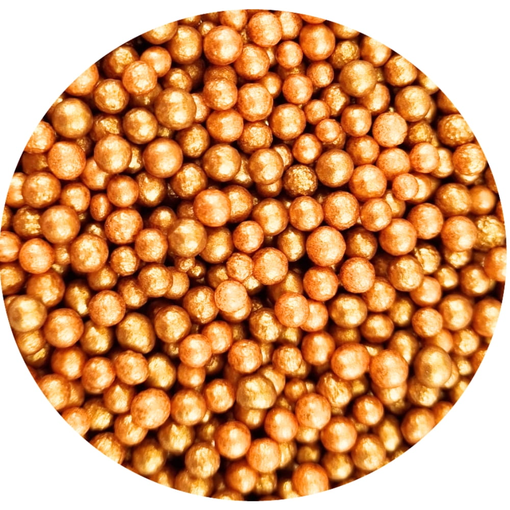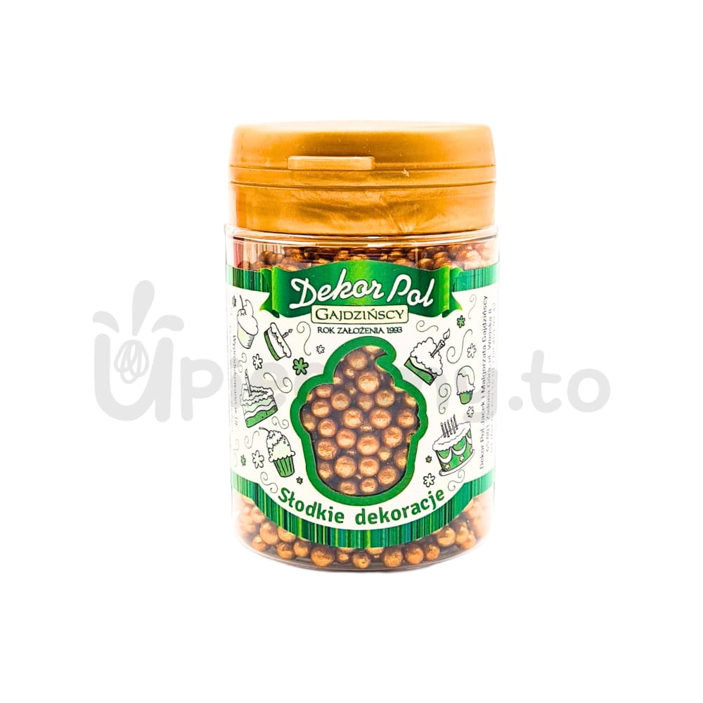 Perełki to małe, okrągłe kuleczki. Mają piękny, świecący złoty kolor i 4 mm średnicy. To błyszcząca, cukrowa posypka nie wpływa na zmianę smaku dekorowanych wyrobów, jest wykonana z naturalnych barwników i ma smak masy cukrowej. To bardzo uniwersalna posypka, idealna do dekoracji babeczek, ciasteczek, pierniczków, muffinek, tortów, deserów, wypieków, cake pops, pralin, trufli, czekolady, lodów oraz wielu innych słodkich wyrobów, zwłaszcza tych z kremami i polewami. Sprawdzi się na każdą okazję: ślub, komunię, karnawał, urodziny, dzień matki i wiele innych. Zapakowana w zamykany plastikowy pojemnik 60 g.