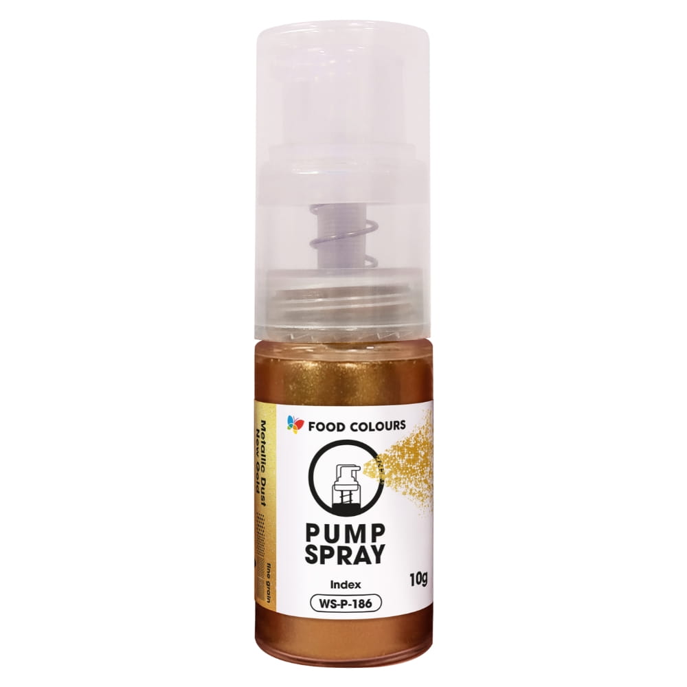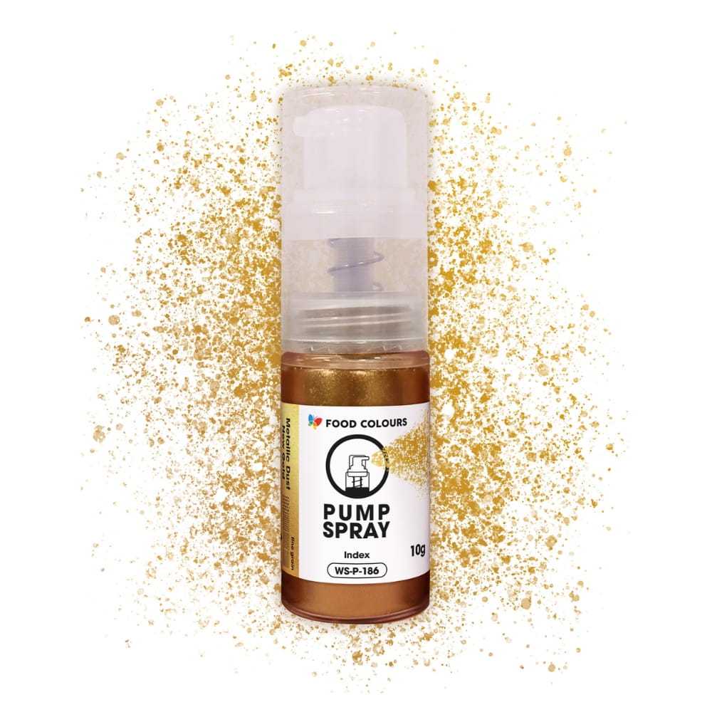 Złoty pyłek w postaci suchego sprayu, który tworzy efekt metalicznego połysku na dekorowanych powierzchniach. Idealny produkt do spektakularnego wykończenia cukierniczych dzieł. Można nim dekorować powierzchnie i masy, kremy, torty, marcepan, formy do pralin, dekoracje cukrowe, żele, czekoladki, dekoracje cukrowe i praktycznie wszystkie produkty cukiernicze. Dzięki pompce jest bardzo łatwy i wygodny w stosowaniu, także w domowych warunkach.
