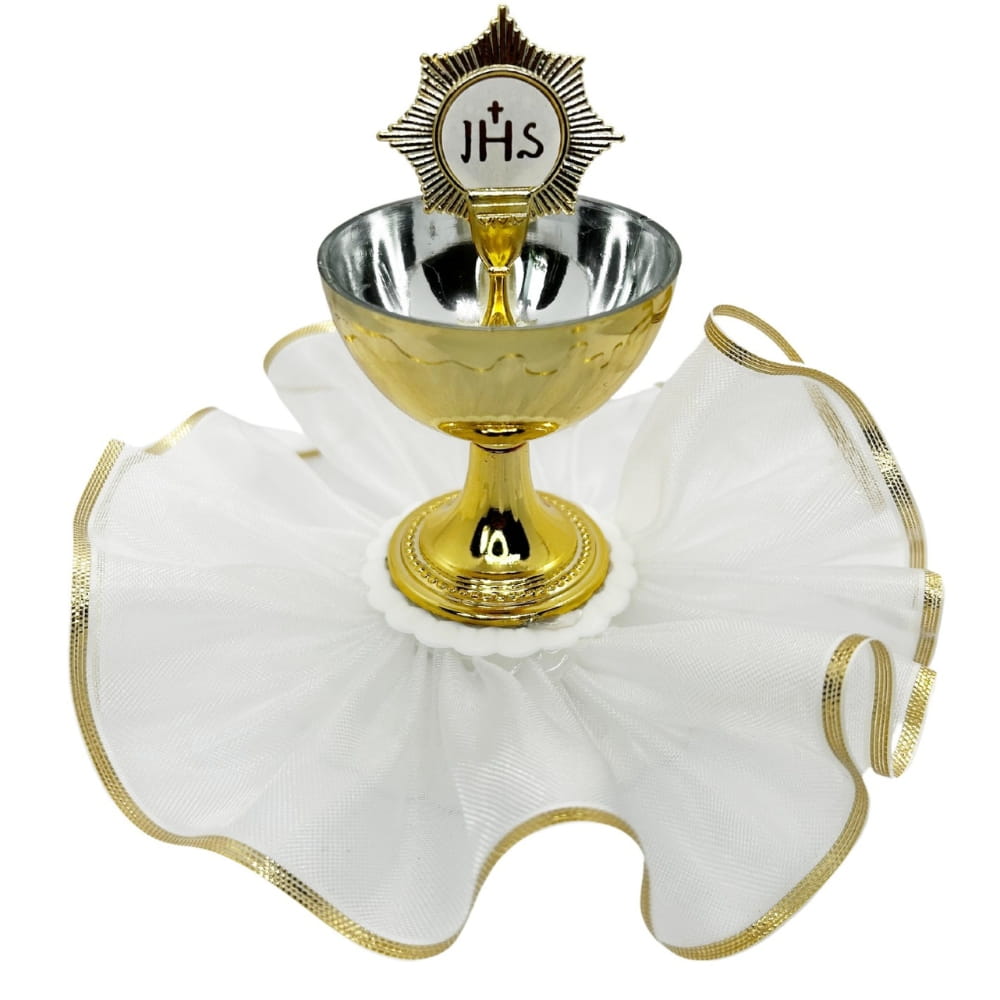 Złoty kielich z hostią i stroikiem to piękna, niejadalna dekoracja na zwieńczenie tortu komunijnego. Lśniące złoto, delikatna biel i najważniejszy symbol Pierwszej Komunii Świętej: hostia z kielichem. Ta duża dekoracja zmieni każdy skromny tort w komunijne arcydzieło przyciągające wzrok wszystkich gości. Dekoracja posiada stabilną, białą podstawkę. Idealny pomysł na ozdobienie dużego i średniego trotu, pięknie łączy się z małymi dekoracjami, białym tynkiem czy obłożeniem z białej masy cukrowej. Sprawdzi się także jako dekoracja stołu. Ten stroik komunijny będzie wyglądał pięknie przez cały czas trwania nawet najdłuższej uroczystości. Na koniec może stanowić miłą i trwałą pamiątkę komunii.